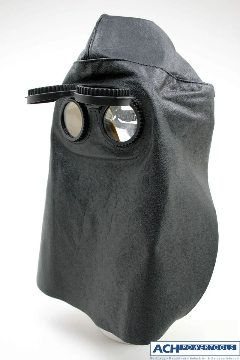 Lederkopfhaube mit Klappbrille, ohne Nase, hinten offen, Gläser DIN 11