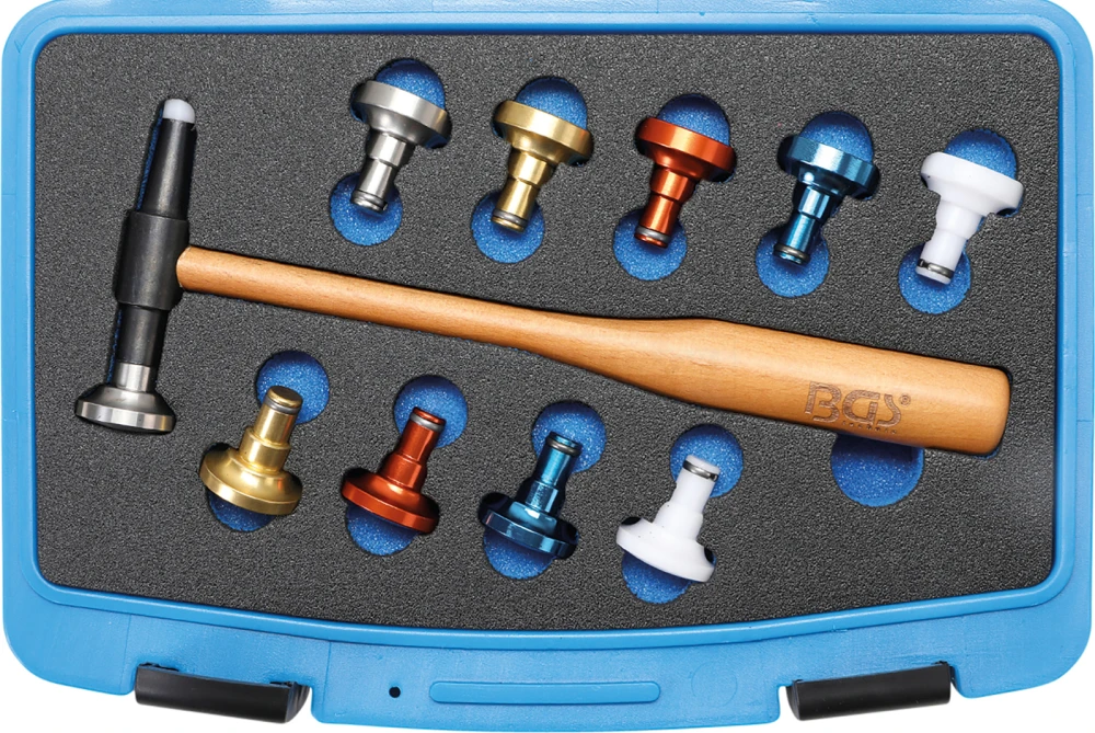 - 10 auswechselbare Köpfe, jeweils flach und halbrund, Ø 28 mm