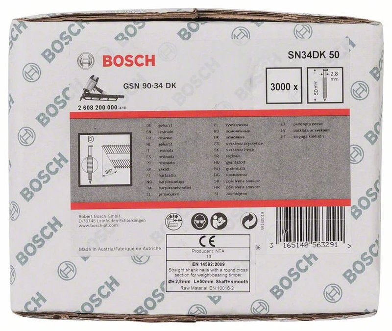 D-Kopf Streifennagel 34 Grad. Nagel für Bosch-Druckluftnagler. Geharzt Glatte Ausführung, Typ SN34DK 50, blank. Schaftdurchmesser 2,8 mm, Länge 50 mm. Passend zu GSN 90-34 DK Professional. Geeignet für Dachkonstruktionen, Holzbau, Tür- und Fensterrahmen, Möbelrahmen, Palettenbau, Kistenbau. Alle Nägel sind zusätzlich geharzt (für besseres Eindringen und höhere Haltekraft). Alle Nägel werden in Europa hergestellt und bürgen daher für eine hohe, konstante Qualität. Durch die Behandlung mit Harz lassen sich die Nägel leichter in das Material eintreiben. Dieser sorgt gleichzeitig für höheren Halt.