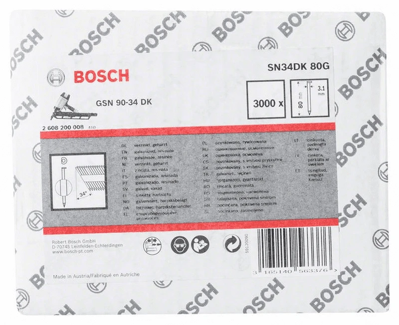 D-Kopf Streifennagel 34 Grad. Nagel für Bosch-Druckluftnagler. Geharzt Glatte Ausführung, Typ SN34DK 80G, verzinkt. Schaftdurchmesser 3,1 mm, Länge 80 mm. Passend zu GSN 90-34 DK Professional. Geeignet für Dachkonstruktionen, Holzbau, Tür- und Fensterrahmen, Möbelrahmen, Palettenbau, Kistenbau. Alle Nägel sind zusätzlich geharzt (für besseres Eindringen und höhere Haltekraft). Alle Nägel werden in Europa hergestellt und bürgen daher für eine hohe, konstante Qualität. Durch die Behandlung mit Harz lassen sich die Nägel leichter in das Material eintreiben. Dieser sorgt gleichzeitig für höheren Halt.