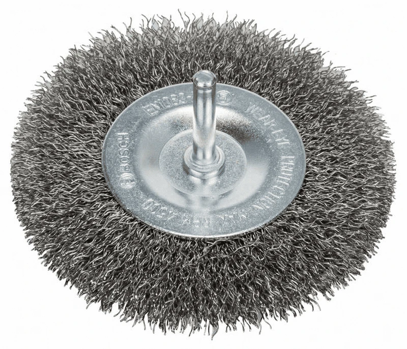 Scheibenbürste mit Spannschaft 6 mm. Edelstahlbürste für Bohrmaschinen. Gewellter Draht, Drahtstärke: 0,3 mm, Bürstenbreite: 10 mm, Durchmesser Bürste: 100 mm, Drehzahl, max. min-1: 4500 U/min. Optimal geeignet für das Entfernen von Anlassfarbe bei Schweißnähten auf Edelstahl. Geeignet für leichte bis mittelschwere Reinigungsarbeiten auf kleinen Flächen, in Rillen oder an Kanten auf Edelstahl, Aluminium oder Buntmetallen, wie Entrosten, Aufrauen, Mattieren, Entlacken und Strukturieren.