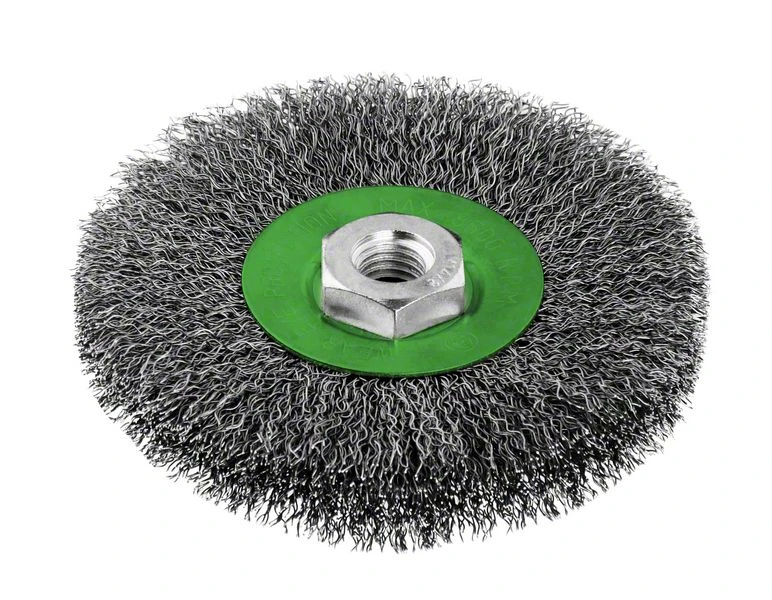 Scheibenbürste Heavy for Inox mit Gewinde M 14. Edelstahlbürste für Winkelschleifer und Geradschleifer. Gewellter Draht, rostfrei, Drahtstärke: 0,3 mm, Durchmesser Bürste: 115 mm, Drehzahl, max. min-1: 8500 U/min, Gewinde: M 14. Optimal geeignet für das Entfernen von Anlassfarbe bei Schweißnähten auf Edelstahl. Geeignet für leichte bis mittelschwere Reinigungsarbeiten bei hohen Umfangsgeschwindigkeiten auf kleineren Flächen, in Rillen oder an Kanten auf Edelstahl, Aluminium oder Buntmetallen, wie Entrosten, Aufrauen, Mattieren, Entlacken und Strukturieren. Passend zu allen Winkelschleifern mit M 14 Gewinde sowie GGS 6 S Professional.
