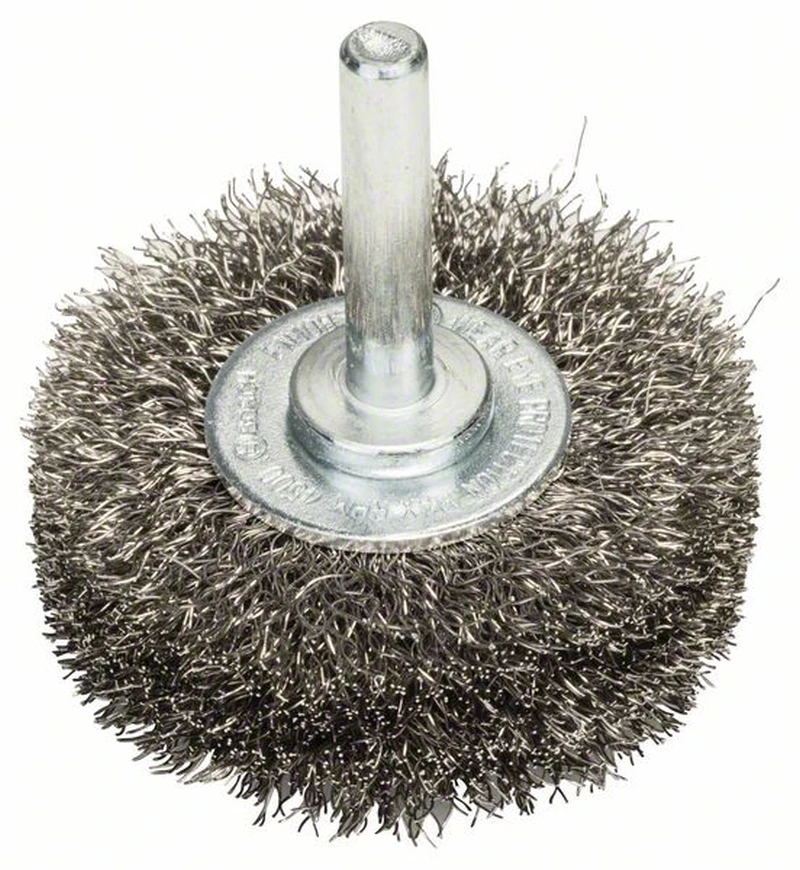 Scheibenbürste mit Spannschaft 6 mm. Edelstahlbürste für Bohrmaschinen. Gewellter Draht, Drahtstärke: 0,2 mm, Durchmesser Bürste: 50 mm, Bürstenbreite: 15 mm, Drehzahl, max. min-1: 4500 U/min. Optimal geeignet für das Entfernen von Anlassfarbe bei Schweißnähten auf Edelstahl. Geeignet für leichte bis mittelschwere Reinigungsarbeiten auf kleinen Flächen, in Rillen oder an Kanten auf Edelstahl, Aluminium oder Buntmetallen, wie Entrosten, Aufrauen, Mattieren, Entlacken und Strukturieren.