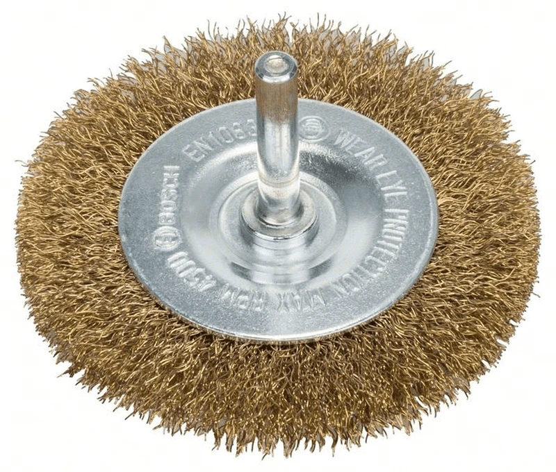 Scheibenbürste mit Spannschaft 6 mm. Messingbürste für Bohrmaschinen. Gewellter Draht, vermessingt, Durchmesser Bürste: 75 mm, Drahtstärke: 0,2 mm, Bürstenbreite: 10 mm, Drehzahl, max. min-1: 4500 U/min. Optimal geeignet für das Entfernen von Anlassfarbe auf Schweißnähten. Geeignett für leichte bis mittelschwere Reinigungsarbeiten auf kleinen Flächen, in Rillen oder an Kanten auf Metall oder Buntmetall, wie Entrosten, Aufrauen, Mattieren und Entlacken. Bearbeiten von Holz. Vorteil: Korrosionsschutz durch vermessingten Draht.