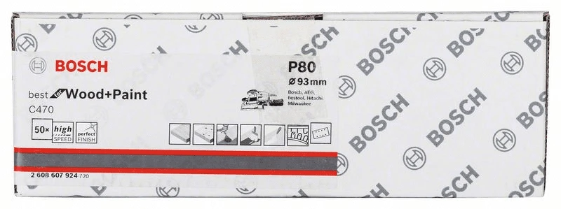 Schleifblatt C470. Best for Wood and Paint. 50er-Pack. Schleifblatt für Schwingschleifer. 8 Löcher, mit Klettsystem. Blattabmessung Breite: 93 mm, Länge: 186 mm, Körnung 80. Leistungsstarkes, fertig zugeschnittenes Schleifblatt mit Klettsystem für schnellen Blattwechsel. Mit Absauglöchern für interne Staubabsaugung. Geeignet für das Schleifen von Holz, Farbe, Lack, Spachtel. Passend zu Schwingschleifern von Bosch, AEG, Festool, Hitachi, Milwaukee.