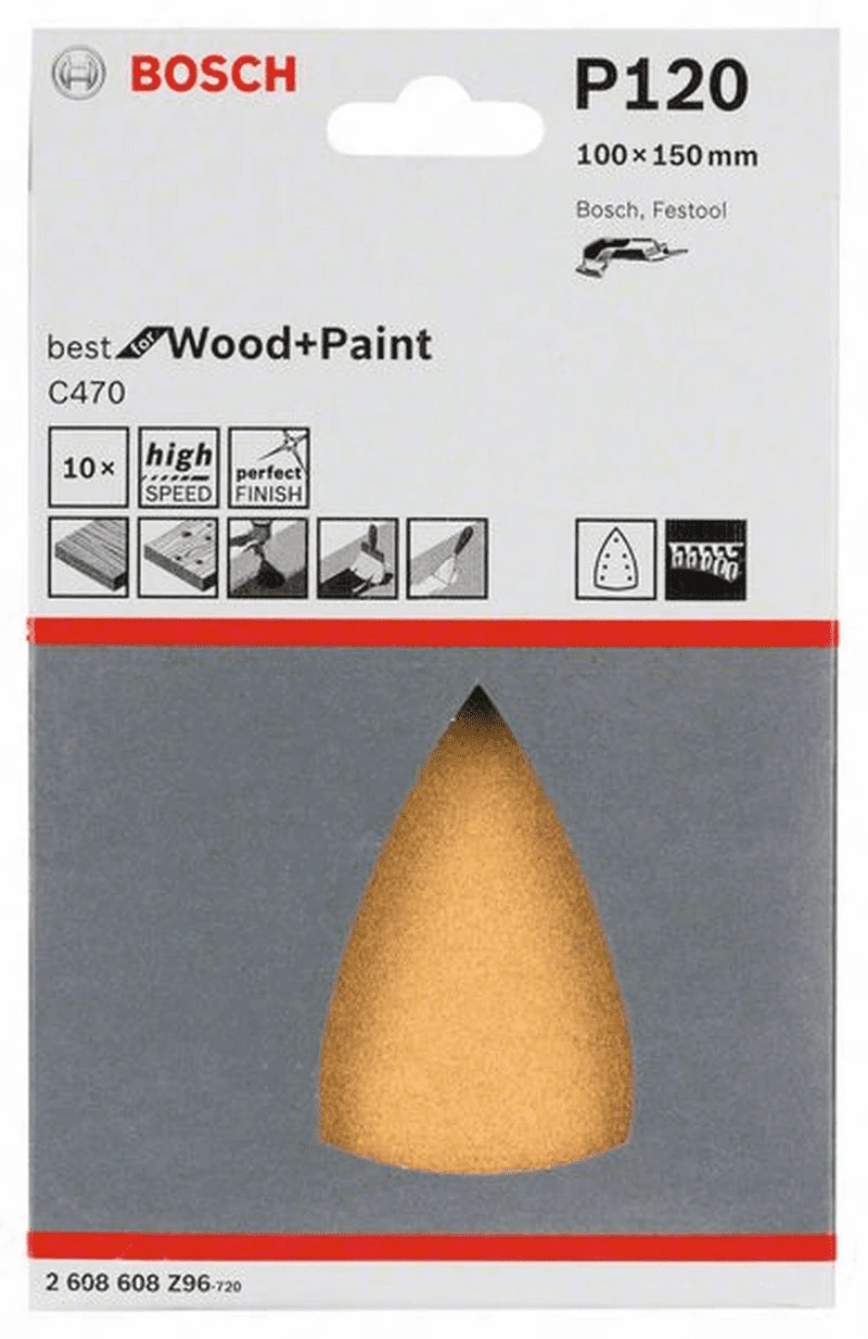 Schleifblatt C470. Best for Wood and Paint. 5 x 10er-Pack. Schleifblatt für Deltaschleifer. 7 Löcher, mit Klettsystem. Breite: 100 mm, Länge: 150 mm, Körnung 120. Leistungsstarkes Schleifblatt. Zum Schleifen in Ecken und Flächen. Mit Klettsystem für schnellen Blattwechsel und Absauglöchern für interne Staubabsaugung. Geeignet für das Schleifen von Holz, Farbe, Lack, Spachtel. Passend zu Deltaschleifern von Bosch, Festool.