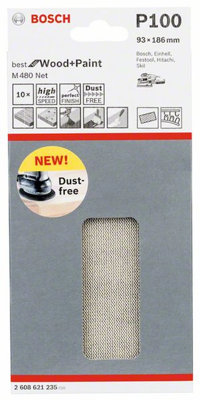 BOSCH Professional Schleifblatt M480 Net, Best for Wood and Paint, 93 x 186 mm, 100, 10er-Pack 2608621235