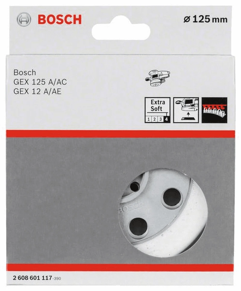 Schleifteller für Bosch-Exzenterschleifer. Ausführung: Extraweich. Durchmesser: 125 mm. Extraweiche Schleifteller (grau) für Feinschleifarbeiten und Schleifen an Radien sowie Formteilen. Höchste Oberflächengüte bei geringem Abtrag. Für Lackzwischen- und Lackendschliff bei Schreinern, Lackierern, Küchenbauern, Corian-Verarbeitern. Passend zu GEX 12 A, GEX 12 AE, GEX 125 A, GEX 125 AC Professional.