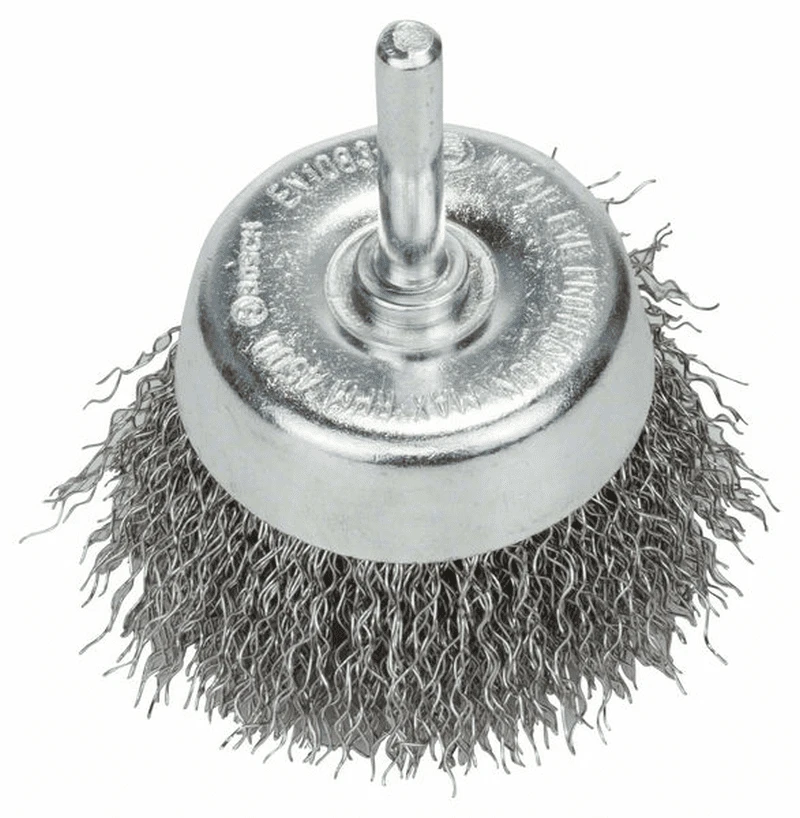 Topfbürste mit Spannschaft 6 mm. Edelstahlbürste für Bohrmaschinen. Gewellter Draht. Durchmesser: 60 mm, Drahtstärke: 0,3 mm, Drehzahl, max. min-1: 4500 U/min. Geeignet für leichte bis mittelschwere Reinigungsarbeiten auf kleinen bis mittleren Edelstahl-, Alu- und Buntmetallflächen, wie entfernen von Beschichtungen, entrosten, aufrauen, mattieren, entlacken, strukturieren.