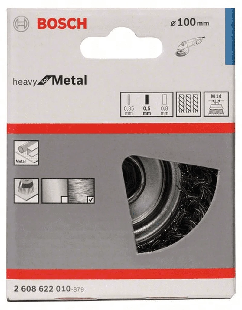 Topfbürste Heavy for Metal mit Gewinde M 14. Stahlbürste für Winkelschleifer und Geradschleifer. Gezopfter Draht. Durchmesser: 100 mm, Drahtstärke: 0,5 mm, Drehzahl, max. min-1: 8500 U/min. Für Winkelschleifer, mind. Durchmesser: 180 mm, Gewinde M 14. Geeignet für schwere Reinigungsarbeiten auf mittelgroßen bis großen Metallflächen, wie Entfernen von starkem Rost oder Unterbodenschutz, Abtragen von Farbe oder Lack. Passend zu Winkelschleifern mit M 14 Gewinde sowie GGS 6 S Professional.
