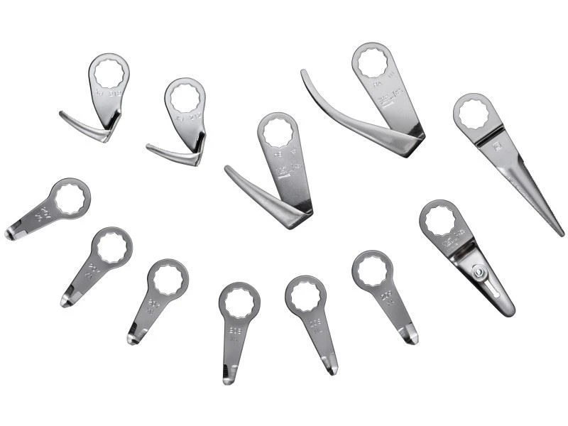 •Zubehör-Set Autoglaser Bestehend aus: 3 Schneidmesser L-Form, verzahnt (Form 207); 2 Schneidmesser L-Form, verzahnt (Form 208); 1 Schneidmesser L-Form, verzahnt (Form 209); je 1 Schneidmesser U-Form, verstärkte Ausführung (Form 157 und 111); 2 Schneidmesser U-Form, verstärkte Ausführung, verzahnt (Form 212); 1 Schneidmesser gerade Form, Z-Biegung mit einstellbarer Anschlagrolle (Form 143); 1 Schneidmeser gerade Form, Z-Biegung verzahnt (Form 081).