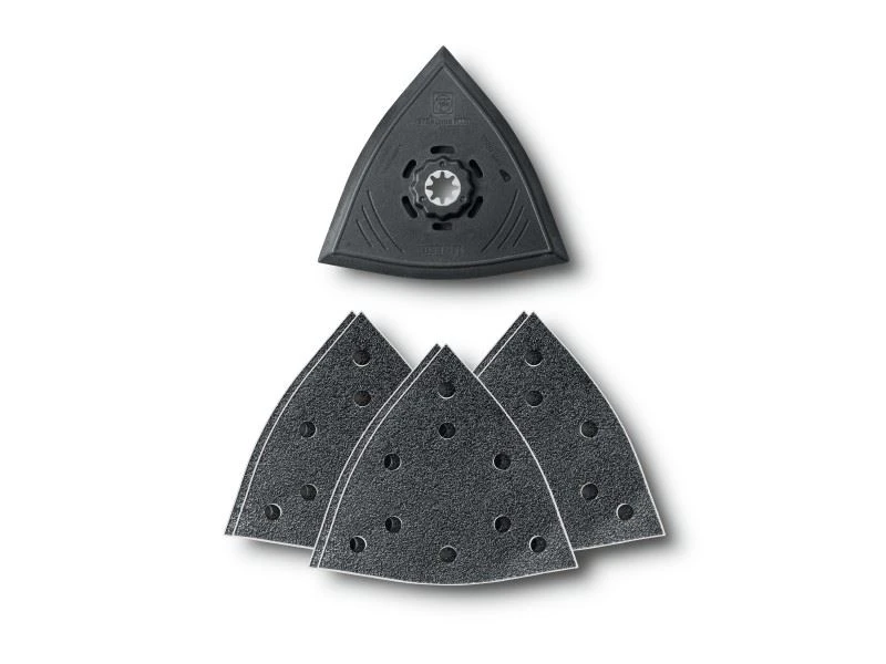 •Schleifset Zum schnellen und wirtschaftlichen Schleifen von mittleren Flächen. Die Alternative zum Exzenter- oder Schwingschleifer. Kein Rückschlageffekt an Kanten. Einfache Handhabung, sehr gute Abtragsleistung. Mit und ohne Staubabsaugung einsetzbar. Kunststoff-Trägerplatte zur Vermeidung von Beschädigungen und Markierungen auf dem Werkstück. Lieferumfang: 1 große gelochte Dreiecks-Schleifplatte (Kantenlänge 130 mm), je 2 gelochte Schleifblätter Korn 60, 80, 180.