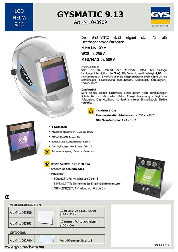 GYS Automatik Schweißhelm GYSMATIC LCD 9/13 G MMA MIG WIG 043909 mit extra großem Visier
