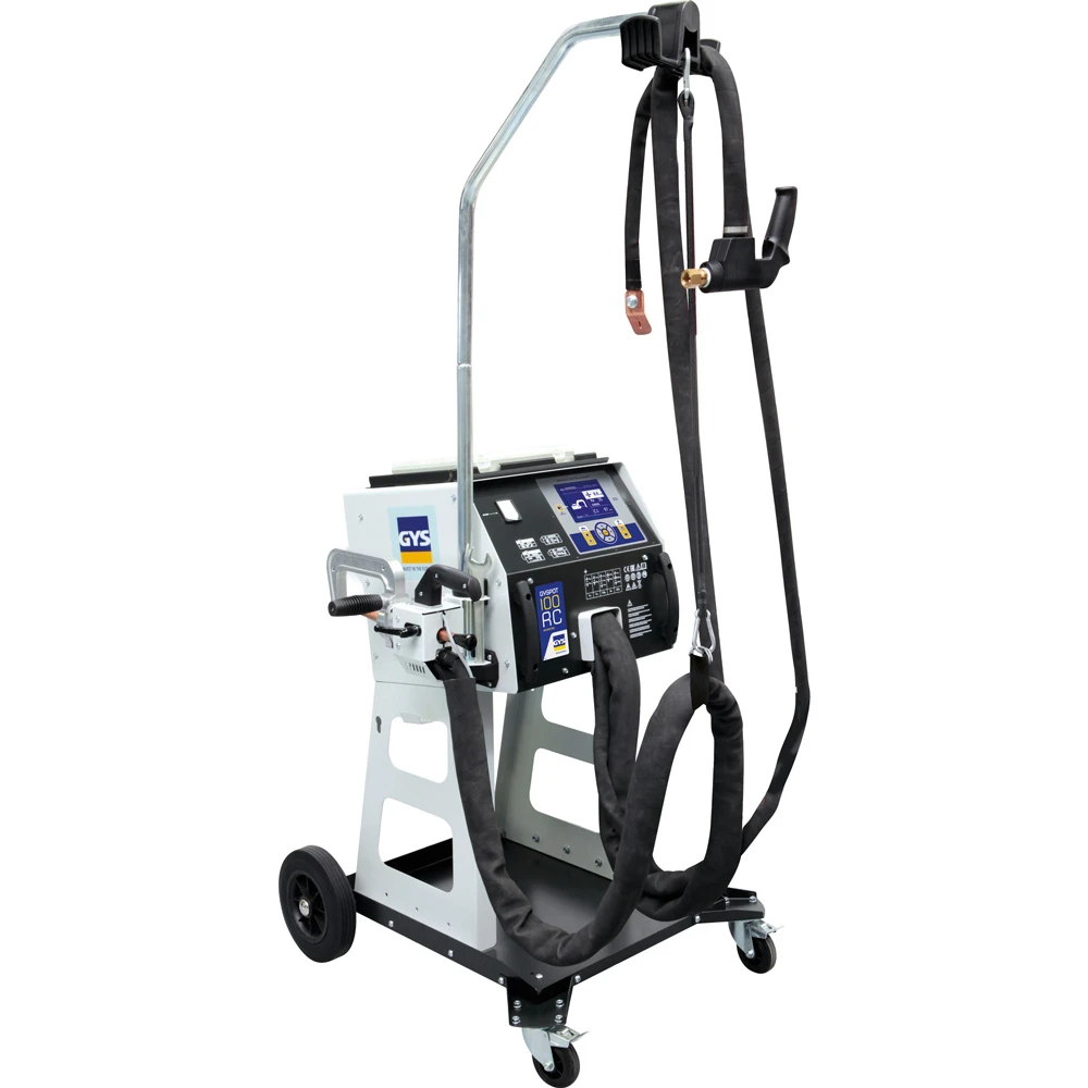 Der GYSPOT INVERTER 100R-C ist ein luftgekühltes Punktschweißgerät, das auch für das Schweißen von hochfesten Stählen geeignet ist. Der Elektrodenanpressdruck kann maximal 300 daN und der Schweißstrom 10 000 A erreichen. Der GYSPOT 100R-C verfügt über eine Schweißdatenerfassung. Als Speichermedium wird eine PC-kompatible SD-Karte eingesetzt.