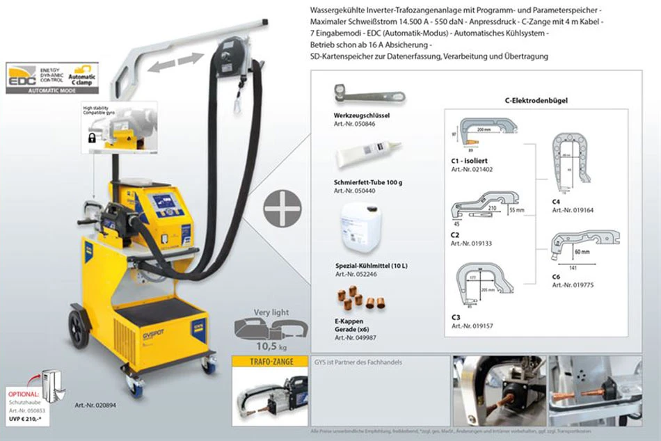 Der GYSPOT INVERTER PTI Evolution-s7 ist eine prozessorgesteuerte Multifunktions- Punktschweißanlage neuester Bauart zur Instandsetzung moderner Fahrzeugkarosserien aus hoch und ultra hochfesten sowie warmformgehärteten Stahlblechen (UHSS/ BTR). Maximaler Elektroden- Anpressdruck von 550 daN bei 8 Bar Schweißleistung von bis zu 14.500 Ampere. Dank hocheffizienter C-Zange mit integrierter Transformatorentechnologie und 400V Netzanschluss, abgesichert durch 16 bzw. 25 A- Kurve D, sparen Sie während des Schweißens Strom und Kosten: Schweißarbeiten bei begrenzter Spannungsversorgung werden möglich. Die Bedienung dieser Anlage ist durch die automatisierte Schweißparametereinstellung im AUTO Modus sehr leicht und einfach.