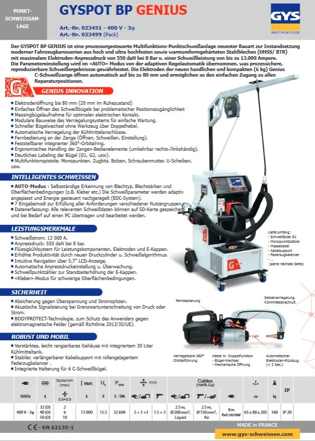 Die GYSPOT INVERTER BP.LG ist eine prozessorgesteuerte Multifunktions-Punktschweißanlage euester Bauart zur Instandsetzung moderner Fahrzeugkarosserien aus hoch und ultra hochfesten sowie warmumformgehärteten Stahlblechen (UHSS/ BTR) mit maximalem Elektroden-Anpressdruck von 550 daN bei 8 Bar und einer Schweißleistung von bis zu 13.000 Ampere. Die Parametereinstellung wird im «AUTO» Modus von der adaptiven Regelautomatik übernommen, was prozessichere, reproduzierbare Schweißergebnissse gewährleistet. Die Elektroden der neuen handlichen und kompakten (6 kg) Genius C-Schweißzange öffnen automatisch auf bis zu 80 mm und ermöglichen so den einfachen Zugang zu allen Reparaturpositionen.