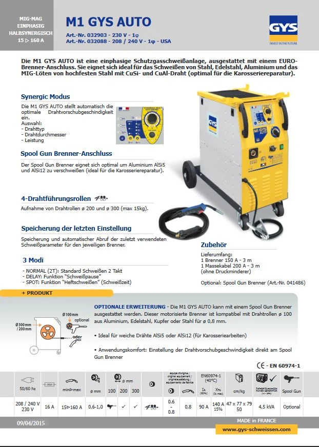 Die M1 GYS AUTO ist eine einphasige Schutzgasschweißanlage, ausgestattet mit einem EURO- Brenner- Anschluss. Sie eignet sich ideal für das Schweißen von Stahl, Edelstahl, Aluminium und das