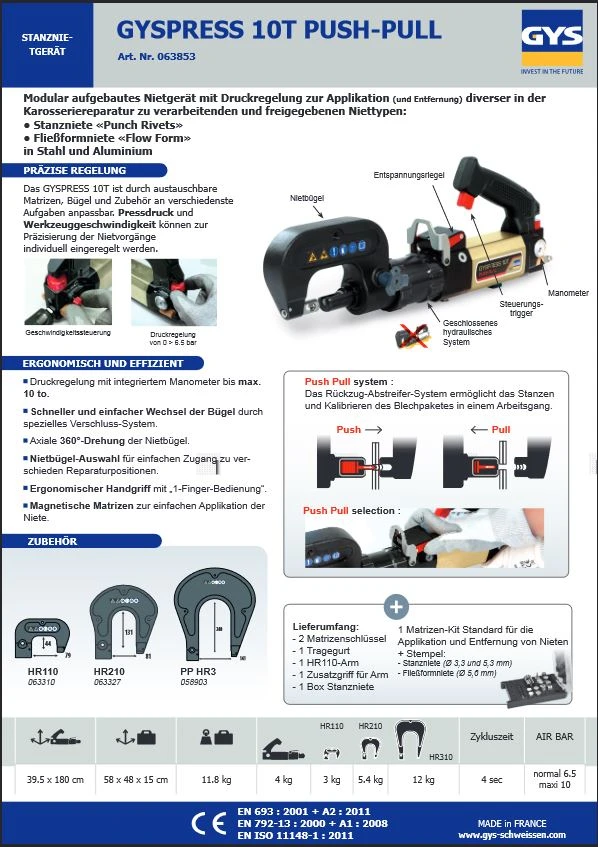 Lieferumfang:– Stanznietgerät GYSPRESS 10T Push Pull (Ref: 063853)