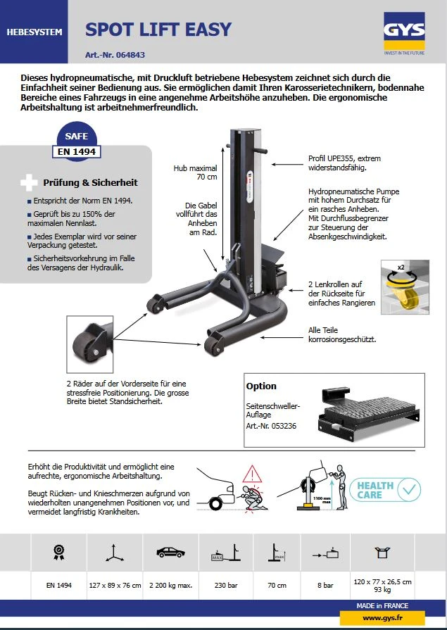 Der Spot Lift Easy ist eine hydropneumatische, mit Druckluft betriebene Hebesystem zeichnet sich durch die Einfachheit seiner Bedienung aus. Sie ermöglichen damit Ihren Karosserietechnikern, bodennahe