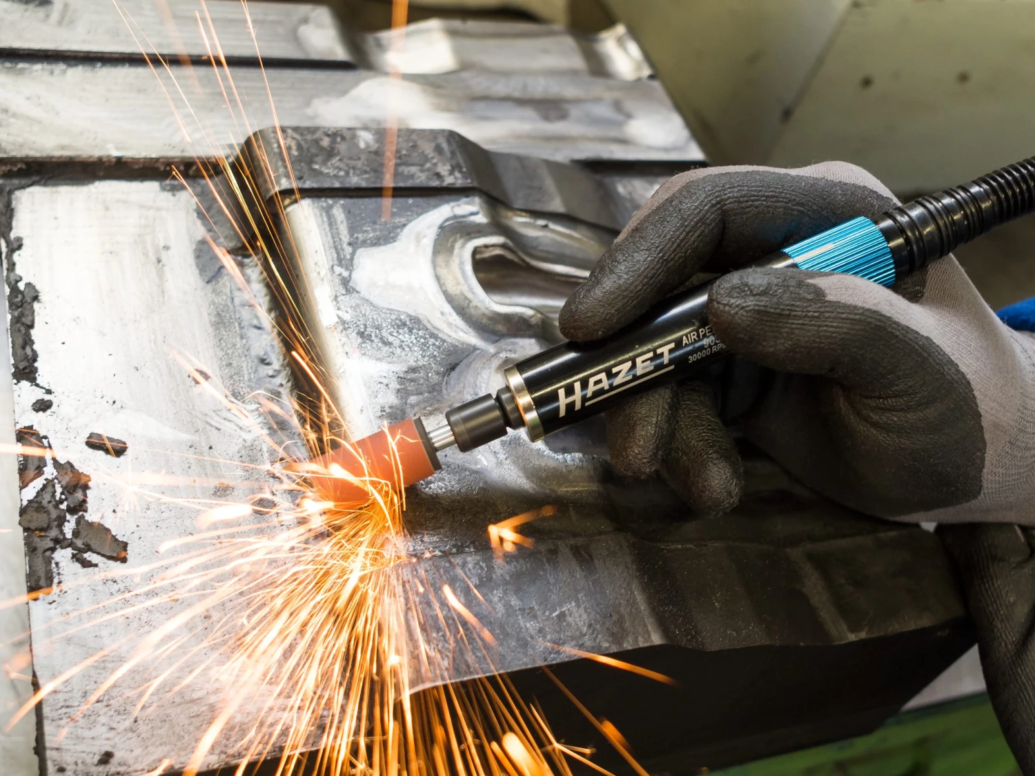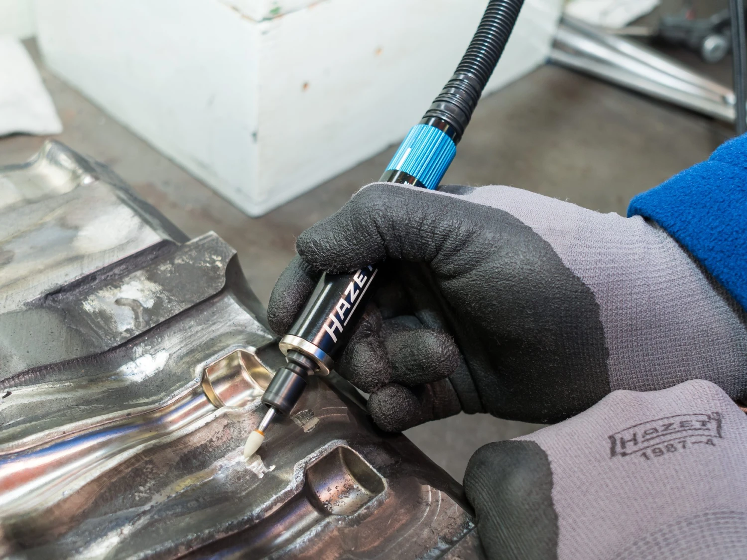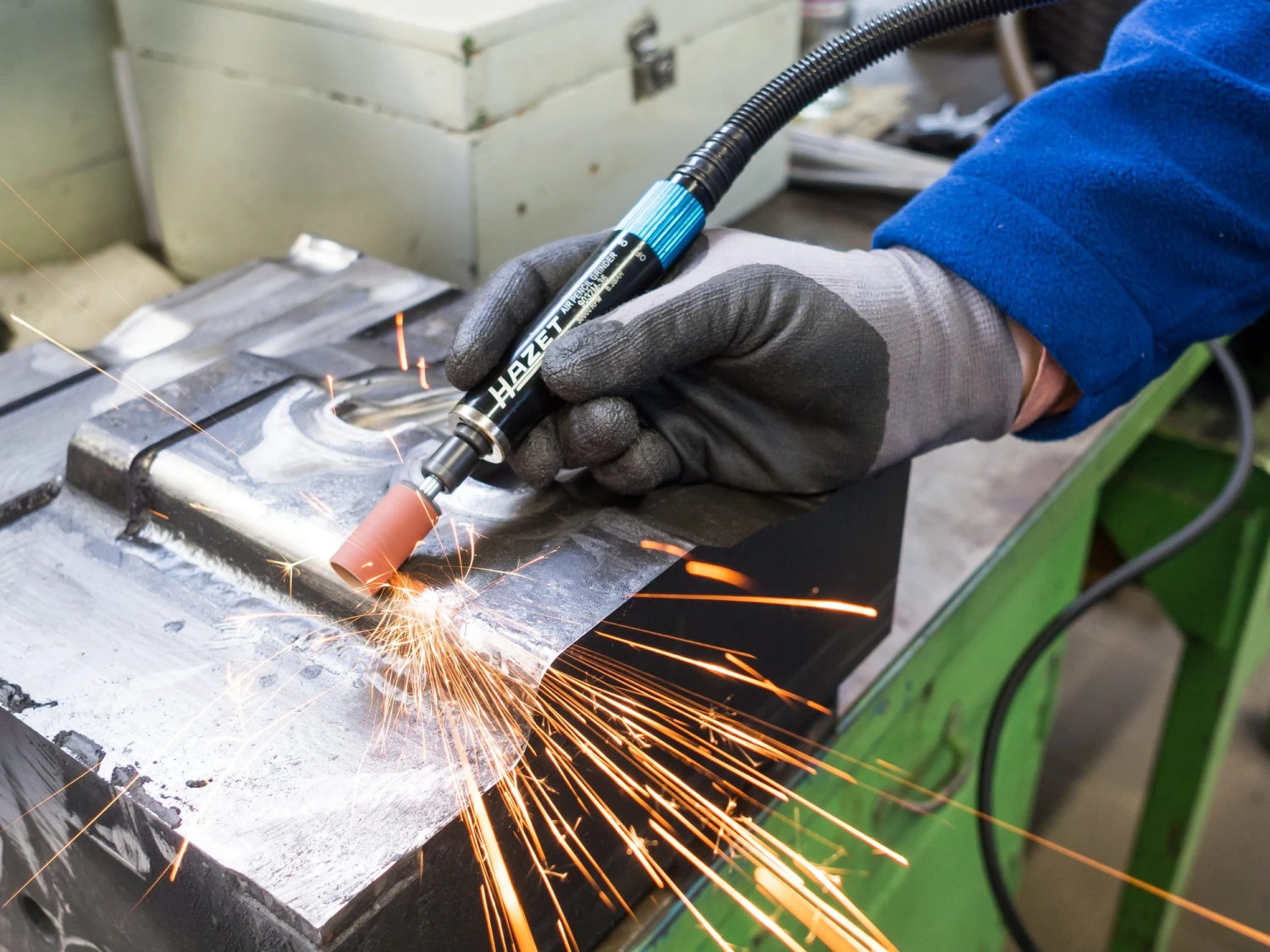 - Geräuscharmer Betrieb: integrierter Abluftschlauch führt Abluft vom Werkstück weg und dämpft den Schall