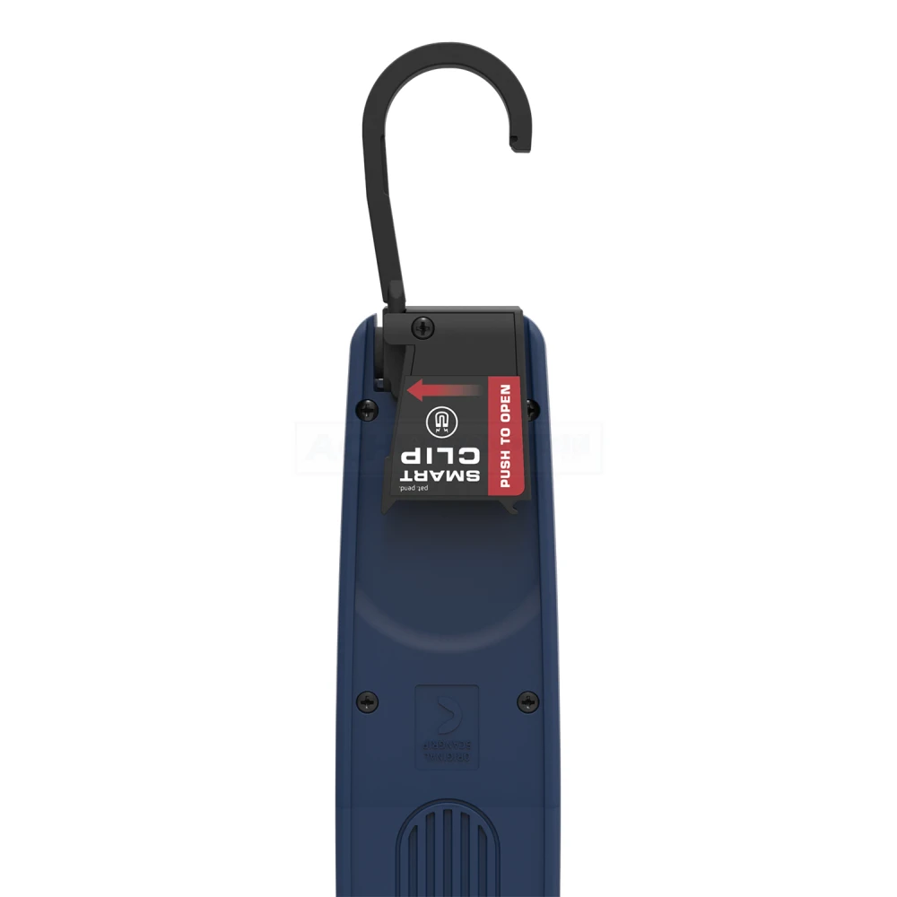 Der kräftige eingebaute Magnet oder der einziehbare Haken ermöglicht flexible Aufstellung der Arbeitsleuchte, wenn beide Hände benötigt werden. Darüber hinaus funktioniert der SMART CLIP als Stütze auf allen vorhandenen Oberflächen.